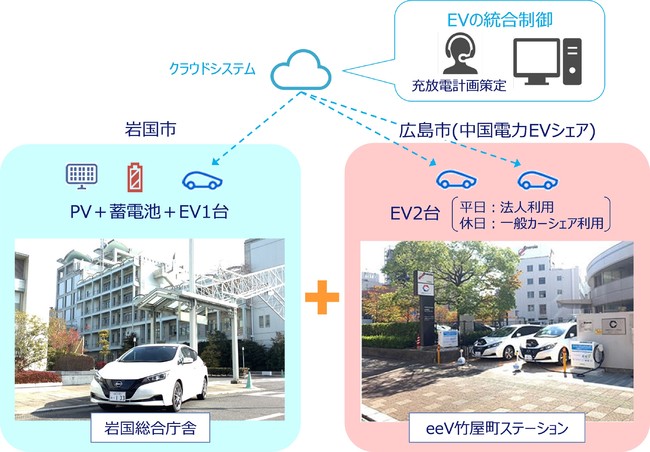 岩国市と広島市の2地点において、計3台のEV(山口県所有1台、中国電力が※2で使用する2台)をREXEVのEV管理および制御の仕組みと東芝エネルギーシステムズのVPPクラウドシステムにより遠隔制御することで、エネルギーマネジメントへの活用可能性について検証します。
