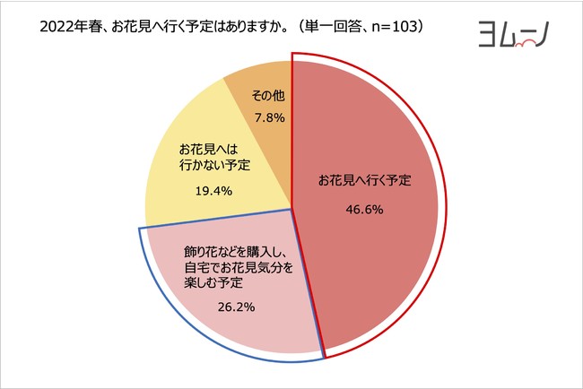 2022年春、お花見へ行くかどうかを尋ねたところ、「お花見へ行く予定」との回答が46.6%で最多となり、次いで「飾り花などを購入し、自宅でお花見気分を楽しむ予定」との回答が26.2%となりました。コロナ禍においても、春の到来を楽しみたいと考える方が多いようです。