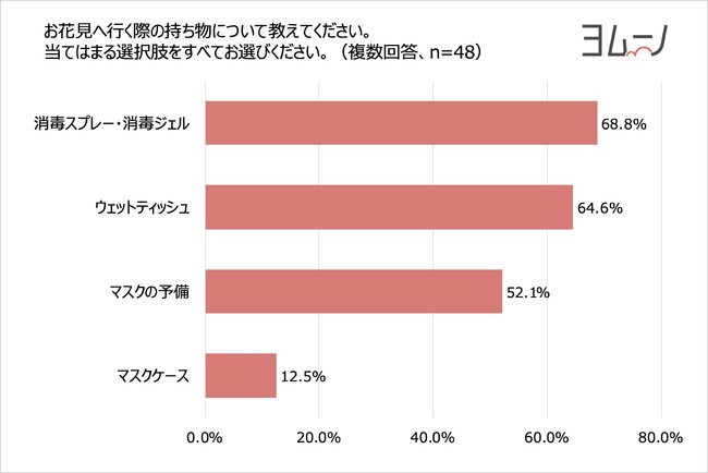 お花見へ行く際の持ち物について尋ねたところ、「消毒スプレー・消毒ジェル」や「ウェットティッシュ」は6割超の方が持参する予定であることが分かりました、また、「マスクの予備」との回答は52.1%にのぼるなど、感染対策への意識が高いことが伺えます。
