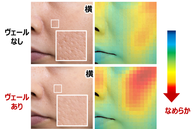 ヴェールの上からメイクをした肌とヴェールなしのメイク肌について、花王が開発した「Kirei肌AI」※3によるなめらかさ評価、およびさまざまな角度から凹凸の目立ちやすさを一度に撮影できる装置を用いて確認しました。
