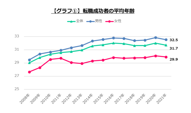 2021年に転職した人の平均年齢は31.7歳で、過去13年で最も高かった前年の32.0歳より0.3歳低下しました。男女別で見ても、男性が0.4歳下がり32.5歳、女性が0.2歳下がり29.9歳で、コロナ禍の前の2019年と同水準になっています(グラフ1.)。