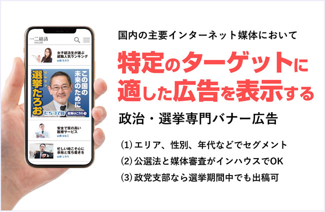 「インターネット上に政治家のバナー(ポスター)を貼ることができる」ネット広告サービスです。具体的には、国内の主要インターネット媒体において、政治家の皆様それぞれが対象としている選挙区内のユーザーだけに表示するディスプレイ(バナー)広告を展開することができます。公職選挙法の確認及び媒体審査がインハウスで一括チェックができ、政治家様側の手間が大幅に軽減されます。リアルのポスターと異なり、事前にどのくらい表示されるかをシミュレーションすることも可能で、同時に想定金額も事前に分かるため、効果の判断がしやすく、少額(5万円)から始めることができます。