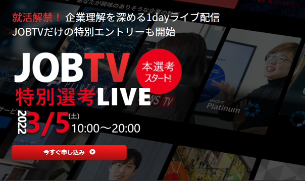 就活解禁!“ES不要&履歴動画応募“型の特別選考LIVE配信 「JOBTV 特別選考1day LIVE」2022年3月5日(土)開催