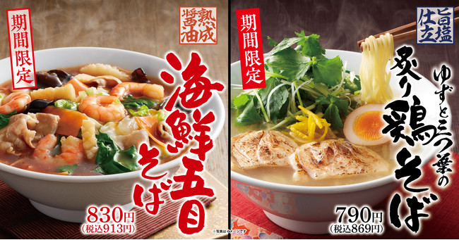 今回登場する期間限定メニューは「ゆずと三つ葉の炙り鶏そば」と「海鮮五目そば」の2種類です。