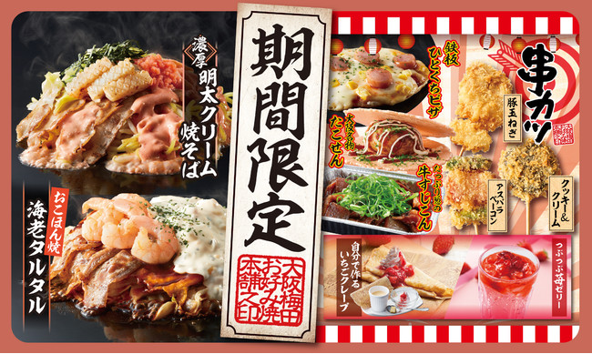 株式会社物語コーポレーション(本社:愛知県豊橋市/代表取締役社長:加藤 央之)は、全国25店舗展開中の『お好み焼本舗』にて、2022年3月1日(火)より、「おこほん焼 海老タルタル」「濃厚明太クリーム焼きそば」をはじめ、本格鉄板メニューや串カツ、デザートなどを期間限定で販売いたします。