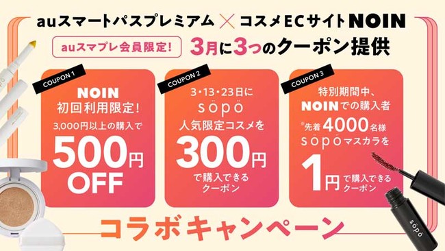 「auスマートパスプレミアム」×コスメECサイト「NOIN」コラボキャンペーン!3・13・23日に「sopo」人気限定コスメを300円で購入可能など3月に3つのクーポン提供