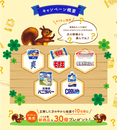 なんと!4月19日(火)にパイの実がロングセラーアイスとコラボした商品を全国で発売しちゃいます!!どのアイスとコラボするかわかりますか?「このアイスとコラボしたらおいしそうだなー」と考えていただきながら、予想してみてくださいね。見事正解し、抽選で当選された方には4月19日発売のパイの実新商品30個セットをプレゼントします。