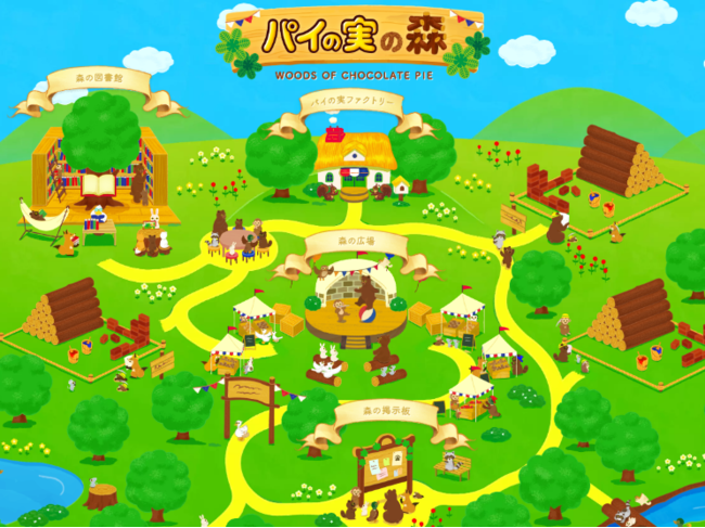 パイの実にまつわる絵本を制作する「森の図書館」や限定情報を公開する「森の掲示板」、素敵なプレゼントキャンペーンを行う「森の広場」などをご用意しています。パイの実の森は順次拡張していきますのでご期待ください。
