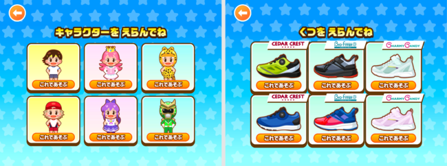 かけっこをするキャラクターと靴を選択します。キャラクターによって走りの特性が変わります。