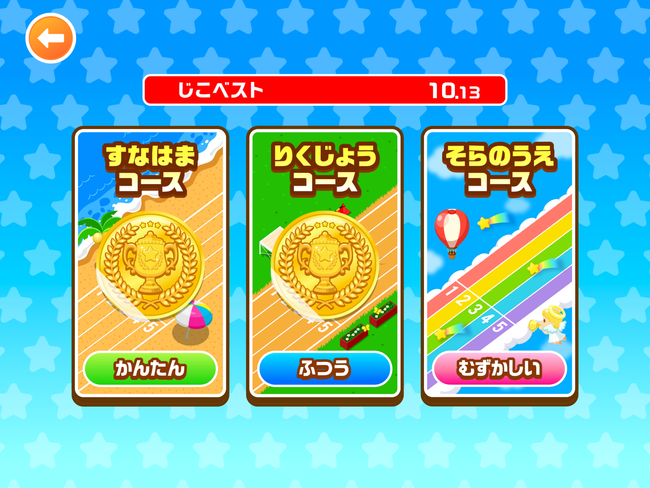 難易度を「かんたん」「ふつう」「むずかしい」の中から選択します。(初回プレイ時は「かんたん」のみ選択可能です。難易度の低いコースで1位を獲得することで、1つ上の難易度のコースを選択できるようになります。)