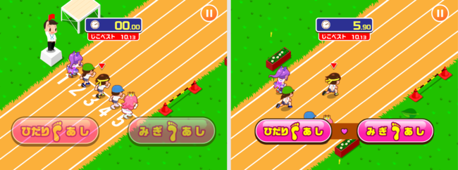 「ひだりあし」「みぎあし」ボタンを交互にタップすることで走ることができます。誤って転んでしまわないよう、タイミングよく交互にタップすることで、速く走ることができます。