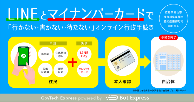 Bot Express、LINEとマイナンバーカードで「行かない・書かない・待たない」行政手続きを実現。広島県福山市・神奈川県座間市・愛知県東郷町へ導入