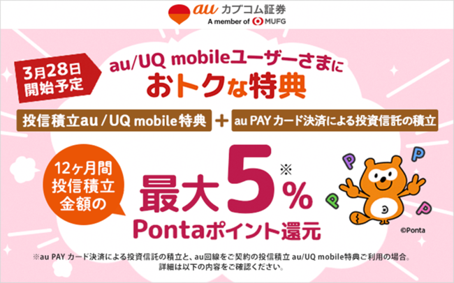 au/UQ mobile×auカブコム証券 投資信託の積立金額の最大4%をPontaポイントで12ヶ月間還元