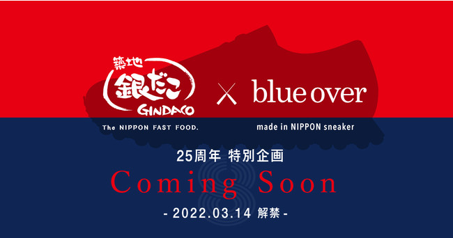 純国産スニーカーブランド 「blueover(ブルーオーバー)」を展開する株式会社BATON(本社:大阪府大阪市、代表取締役社長:渡利ヒトシ)は「築地銀だこ」を展開する株式会社ホットランド(本社:東京都中央区、代表取締役社長:佐瀬守男)とタッグを組み、2022 年 3 月 14(月)より、築地銀だこ創業 25 周年を記念した 『特別企画』 を実施。