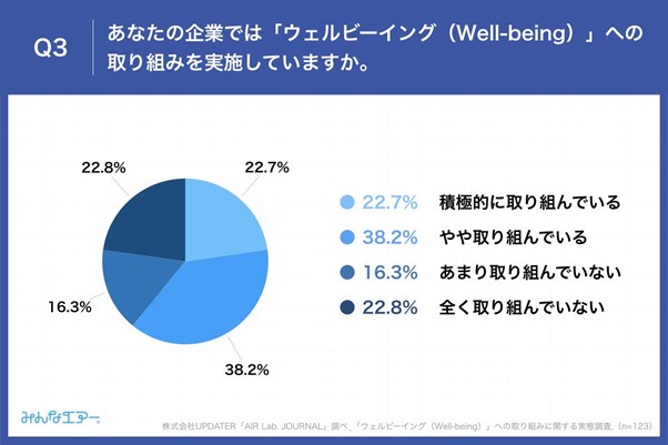 「Q3.あなたの企業では「ウェルビーイング(Well-being)」への取り組みを実施していますか。」(n=123)と質問したところ、「積極的に取り組んでいる」が22.7%、「やや取り組んでいる」が38.2%という回答となりました。