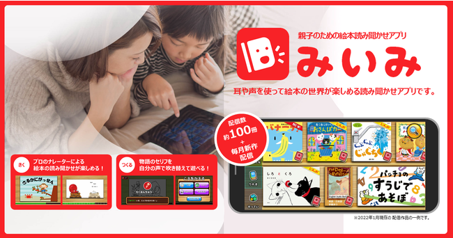 プロのナレーターによる絵本などの読み聞かせを楽しめる【きく機能】や、セリフの一部をキャラクターになりきって吹き替えて世界に一つだけの本を作って遊べる【つくる機能】が、たくさんの親子にご好評をいただいております。