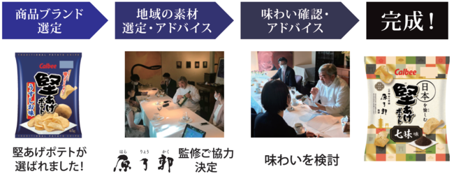 プロジェクト第2弾の今回は、カルビーの商品ブランドから、和とこだわりの世界観を大切にする「堅あげポテト」を選定。フレーバーは三國シェフのアドバイスやブランドとの相性を踏まえ、一子相伝の製法を守る京都衹園の老舗「原了郭」の「黒七味」に決めました。「原了郭」監修のもと、試作を繰り返し、手間をかけて作られる「黒七味」の豊かな香りと奥深い味わいを再現しました。特に、限定商品やこだわりの商品を好む方々に、楽しんでいただきたいです。