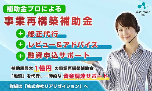 これまで「事業再構築補助金」が100社以上の申請サポート実績のある、株式会社リアリゼイションは、補助金プロによる、「修正代行 / レビュー&アドバイス/融資サポート」の特別サポートを開始しました。