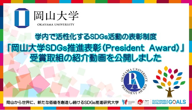 国立大学法人岡山大学(本部:岡山市北区、学長:槇野博史)は、法人活動の中心に国連の「持続可能な開発目標(SDGs)」を掲げており、学長が本部長を務める岡山大学SDGs推進本部が核となり、さまざまな活動を推進しています。その中にSDGs推進のための取り組みを普及推進することを目的に実施されている「岡山大学SDGs推進表彰(President Award)」があります。