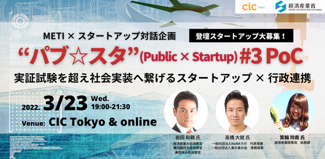 スタートアップと省庁の対話イベント"パブ☆スタ(Public × Startup)"の第3弾ではスタートアップによる実証試験、そしてその後の社会実装までをどのように進めるのか、スタートアップと行政で対話を深めるとともに、行政のサポート施策の紹介を行います。