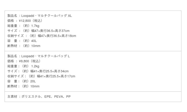 「Loopadd・マルチクールバッグ」は2サイズを展開で、蓋が丈夫かつフラットなので簡易テーブルとしても使用できます。10mm厚の断熱材採用で保冷力に優れるうえ、別売りの氷点下パックを入れるとさらに保冷力が向上します。また、内側の生地は抗菌加工を施しているため、お子様のいる家庭でも安心して使用できます。未使用時は折り畳めるので、コンパクトに収納が可能です。