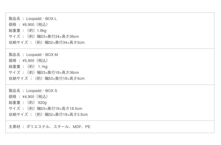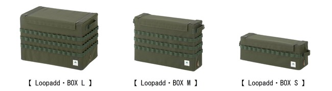 「Loopadd・BOX」は3サイズ展開で、本シリーズのボックス同士でスタッキングが可能かつ、ワイヤー入りで自立する便利なボックスです。使用しないときは折り畳んで小さく収納できるので、場所を取らずに保管できます。