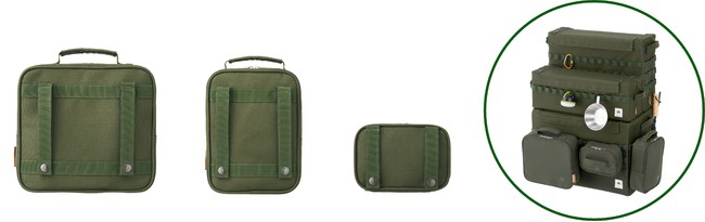 本シリーズのボックス同士は、組み合わせてピッタリとスタッキング可能。キャンプ用品がたくさん入る大容量のLサイズ、たき火台や着火材などをまとめて収納できるMサイズ、薪ばさみなど細長い小物をしまうのに適したSサイズの3サイズを展開。