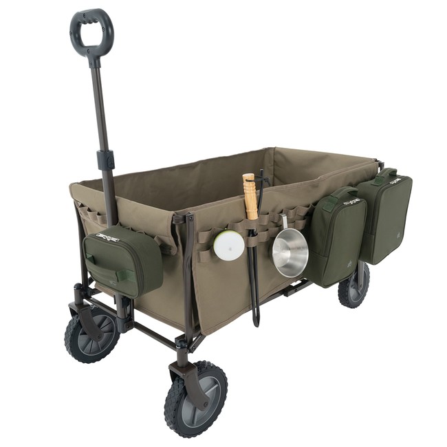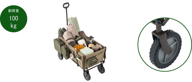 アウトドアはもちろん、ピクニックなどでも使える適度な大きさだから、様々なシーンで活躍。タイヤは地面をとらえて走りやすいひし形ブロックタイヤ採用。