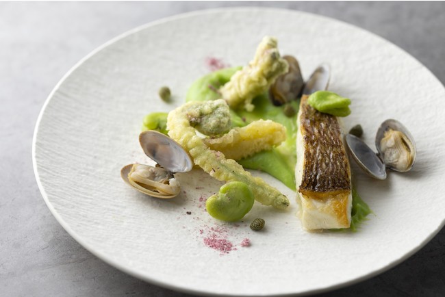 “桜鯛” 桜塩麴マリネのブレゼ 春山菜フリットとロースト空豆、浅利のソース
