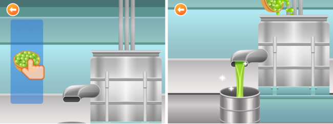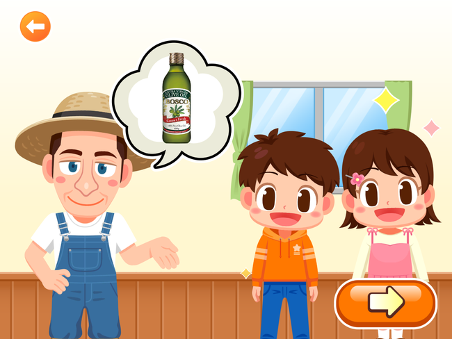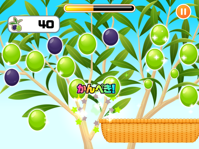フレッシュな「BOSCOエキストラバージンオリーブオイル」を作るために、新鮮なオリーブをタップし、左右に動くカゴへタイミングを合わせて落としていきます。オリーブは、時間が経過するとともに小→中→大→黒色と変化していきます。緑色の大きなオリーブをたくさん集めることで獲得ポイントが上昇します。