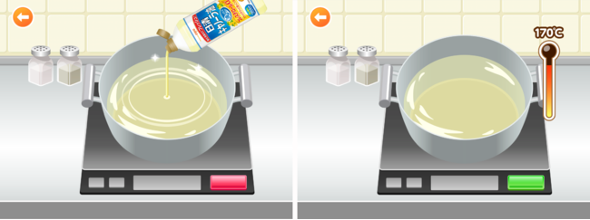 DJアゲアゲの指示に従って、鍋にオイルを注ぎ、鍋を熱します。