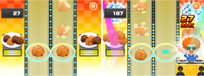 画面上から下へ流れてくるからあげを、音楽のリズムに合わせてタップし、お肉を皿に取りあげます(音楽は難易度の異なる3つから選択できます)。タイミングよく皿に取りあげると、獲得ポイントが上昇します。連続で高ポイントを獲得すると、DJアゲアゲが登場するコンボ演出を見ることができます。