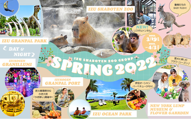 伊豆シャボテン動物公園グループ「伊豆シャボテン動物公園」「伊豆ぐらんぱる公園」「ニューヨークランプミュージアム&フラワーガーデン」「伊豆海洋公園」「伊豆高原旅の駅ぐらんぱるぽーと」では、動物の赤ちゃん誕生、フラワーガーデンの見頃や、シーサイドバーベキューなど、各施設で賑やかな春を体験することができます。