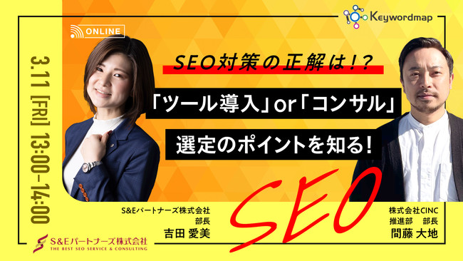 株式会社CINC(シンク、以下CINC)は、2022年3月11日(金)にS&Eパートナーズ株式会社とオンラインセミナー『SEO対策の正解は?「ツール導入」or「コンサル」選定のポイントを知る!』を開催いたします。