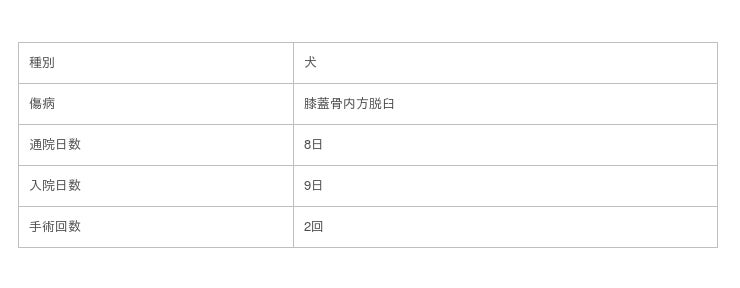 事例の犬の膝蓋骨内方脱臼の通院日数、入院日数、手術回数について
