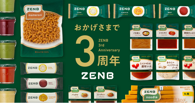 株式会社ZENB JAPAN(ゼンブ ジャパン)(愛知県半田市、以下 ZENB)は、ZENBブランド誕生から3周年を記念し、日頃の感謝を込めた3つのキャンペーンを2022年3月9日(水)から順次実施します。2020年9月に発売した黄えんどう豆100%の新主食「ZENBヌードル」は多くのお客様にご好評いただき、おかげさまで累計300万食を突破。2021年12月に発売したショートパスタタイプ「ZENBマメロニ」なども加え、今後も豆と野菜のまるごと食体験をお届けするために、様々な取り組みを進めてまいります。ぜひご期待ください。