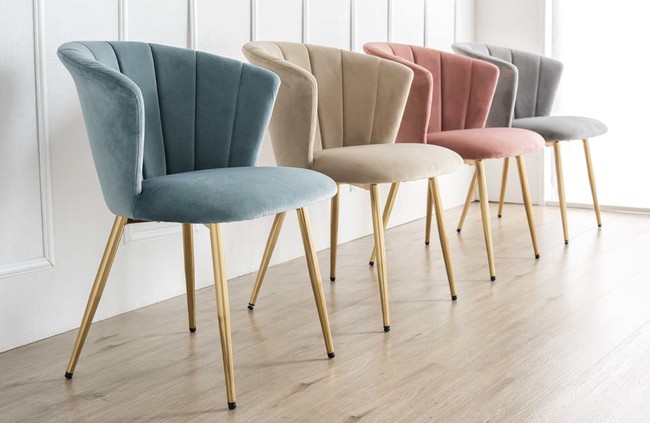 くすみカラーチェアシリーズには3つのモデル展開がされており、「落ち着きあるくすみカラー」「上品なゴールド脚」「肌触りの良いベルベット生地」が特徴です。