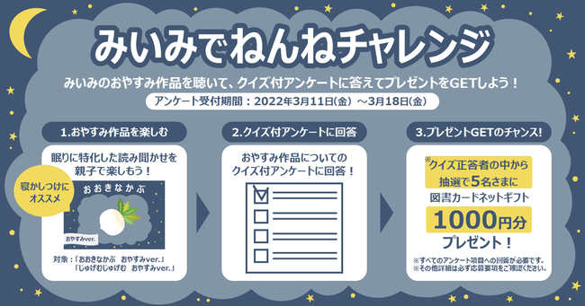 東京ガスは絵本読み聞かせアプリ「みいみ」で、クイズに正解した方の中から抽選で5名様に図書カードネットギフト1000円分をプレゼントするキャンペーンを3月11日から3月18日まで実施します。