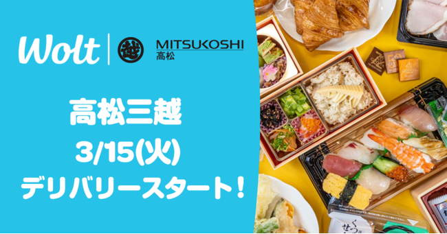 デリバリーサービス「Wolt(ウォルト)」を展開するWolt Japan株式会社は、このたび株式会社高松三越( 香川県高松市内町7-1)と提携、「高松三越」で人気のお弁当や食料品など約200品目を取り揃え、2022年3月15日(火)よりデリバリーサービスを開始いたします。