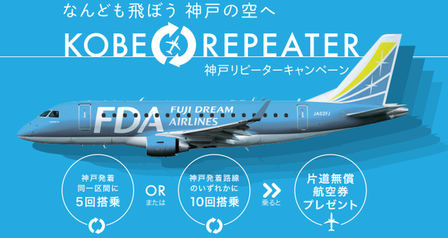 株式会社フジドリームエアラインズ(略称:FDA、本社:静岡県静岡市、代表取締役社長:楠瀬 俊一)は、 2021年夏ダイヤより実施している「神戸リピーターキャンペーン」について、キャンペーンの実施期間を2023年3月25日(土)まで延長いたします。