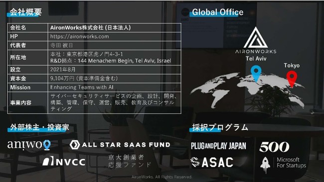 AironWorksは "Enhancing Teams with AI" を企業ミッションに、イスラエル国防軍 Unit 8200出身エンジニアが開発する最先端技術を駆使したサイバーセキュリティソリューションを提供しています。