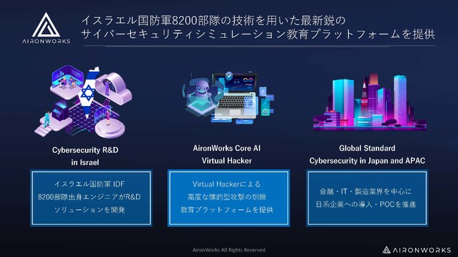 AironWorksは世界トップレベルのハッカー集団であるイスラエル国防軍エリートインテリジェンス部隊 Unit 8200出身エンジニアが開発した、先端テクノロジーを用いた「サイバーセキュリティシミュレーション教育プラットフォーム」です。