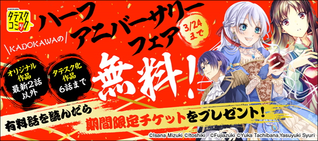 KADOKAWAのタテスクコミックとは、WEB上で縦スクロールとして読むマンガ作品であり、スマートフォンでも気軽に読めるため、多くのユーザーにご利用いただいているコミックジャンルです。その配信開始半年を記念して、オトクなキャンペーンを開催中となります。『文豪ストレイドッグス』『やがて君になる』など、タテスク化したKADOKAWAの人気コミックから、『毒殺される悪役令嬢ですが、いつの間にか溺愛ルートに入っていたようで』をはじめとした、ここでしか読めないオリジナルタテスクコミックまで、計23作品にて合計145話が無料で楽しめます!
