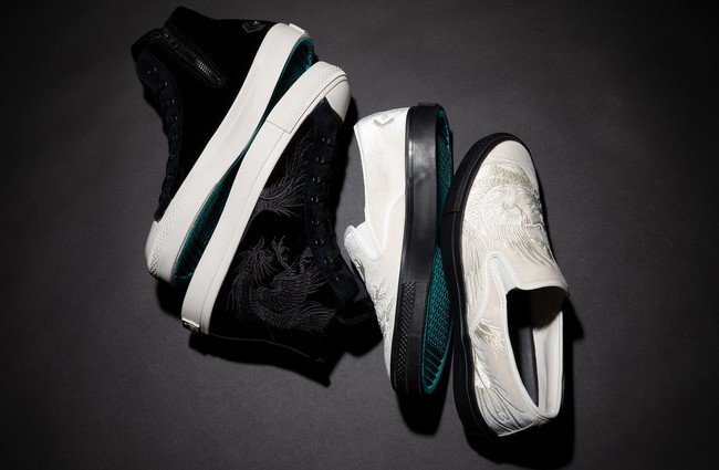 CS SLIP-ON SKをベースにベルベットを採用し、上野氏の脚に入る鳳凰のタトゥーを刺繡で落とし込んだモデル。