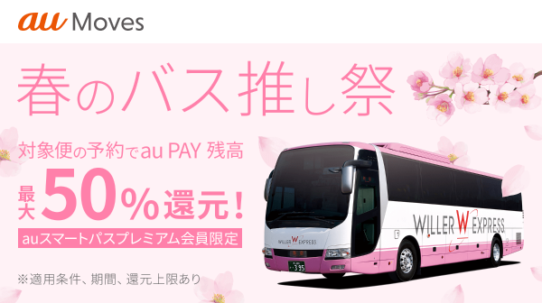 【auスマートパスプレミアム】会員なら50%のau PAY 残高還元!「au Moves 高速バス」春のバス推し祭を開催!
