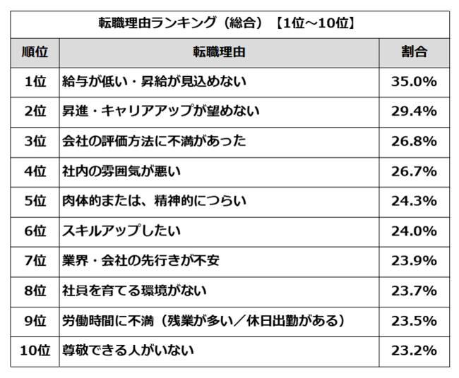転職理由の1位は「給与が低い・昇給が見込めない」(35.0%)となりました。ランキングのトップ10を見ると、2位「昇進・キャリアアップが望めない」(29.4%)、3位「会社の評価方法に不満があった」(26.8%)と、評価や昇進に関する不満が3位までを占めました。一方、人間関係の理由は評価や昇進に関する理由に比べてやや下位の4位「社内の雰囲気が悪い」(26.7%)、10位「尊敬できる人がいない」(23.2%)の2つがランクインしました。
