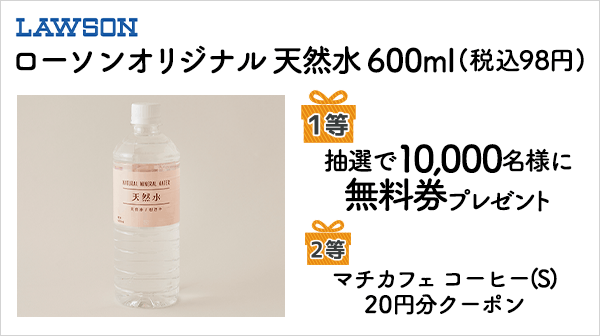 『ローソンオリジナル天然水 600ml(税込98円)』を10,000名様にプレゼント