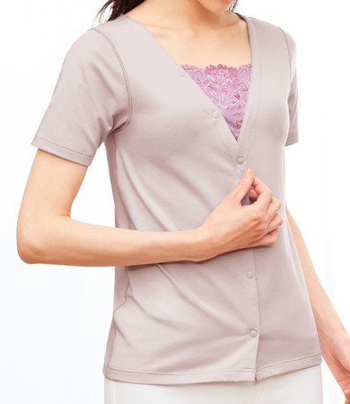 同製品は、フロント部をスナップボタンで開閉にすることでかぶらずに着脱でき、簡便さを高めたユニバーサルデザイン設計のインナーです。スナップボタンの留め外しのしやすさ、肌あたりの良い素材の採用、表示タグの転写使用など、細部にまでこだわって快適に着用できるようにしました。