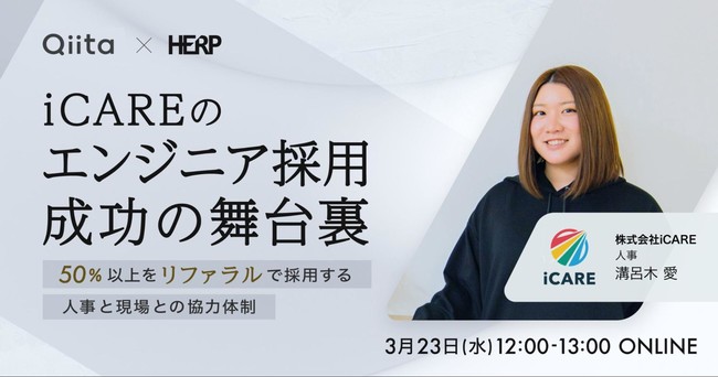 株式会社エイチームのグループ会社であるQiita株式会社(本社:名古屋市中村区、代表取締役社長:柴田健介、以下当社)は、株式会社HERP(本社:東京都品川区、代表取締役CEO:庄田一郎、以下HERP)と共同で、2022年3月23日(水)に無料オンラインセミナー「iCAREのエンジニア採用成功の舞台裏 ~ 50%以上をリファラルで採用する人事と現場との協力体制」を開催いたします。