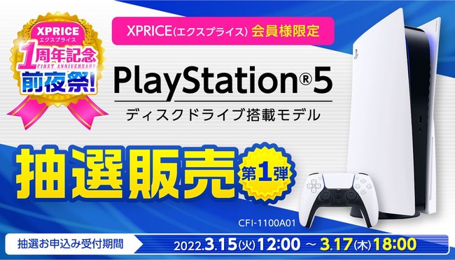 家電EC「XPRICE本店」では、2021年のブランドリニューアルから1周年を記念し、前夜祭としてPlayStation(R)5本体の抽選販売第1弾を2022年3月15日(火)12:00~3月17日(木)18:00の間に開催します。